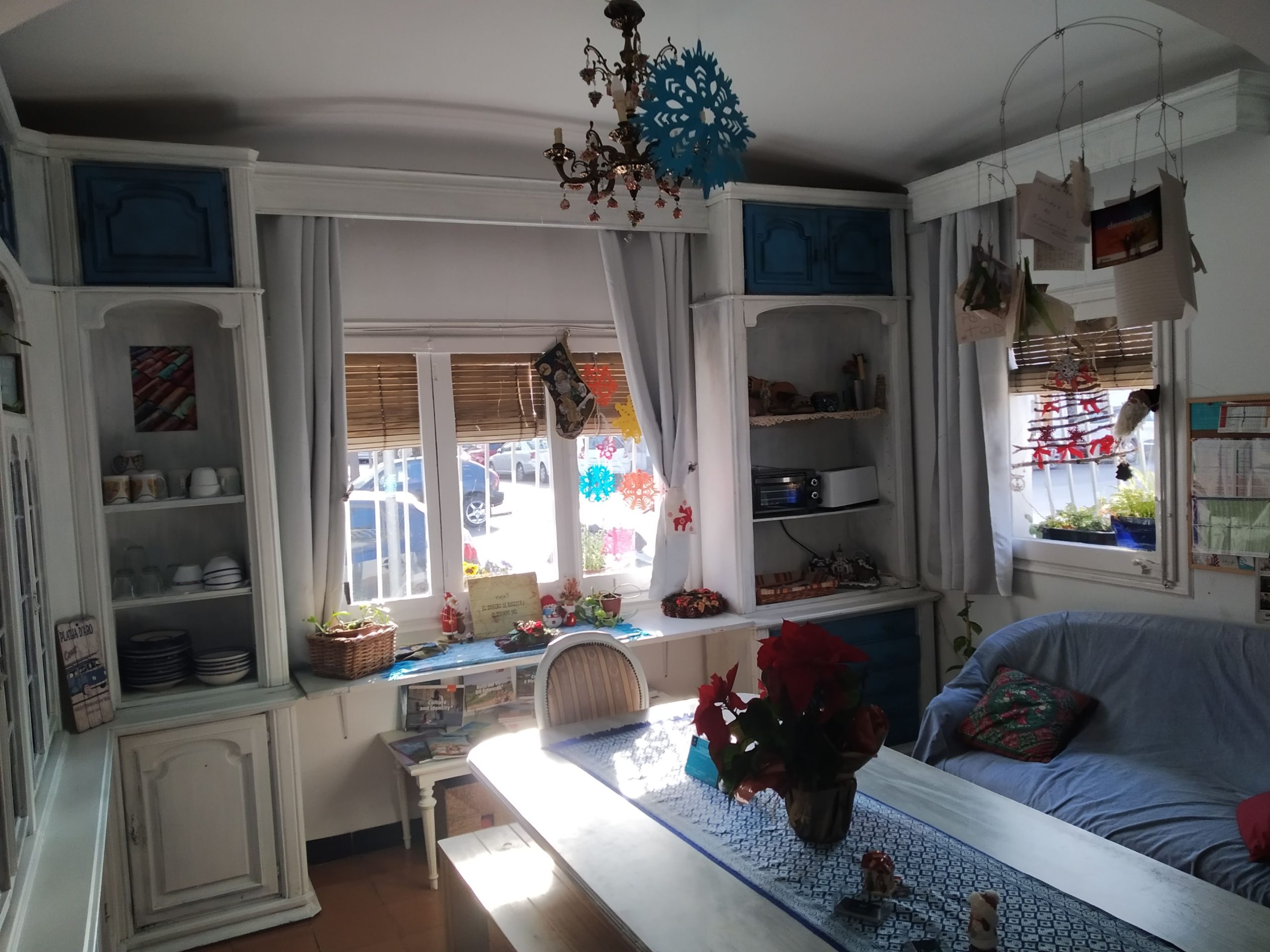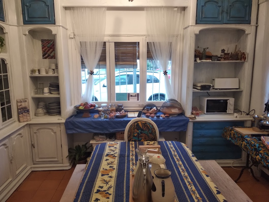 El menjador i sala d’estar és el cor de Can Cocollona, on rebem als nostres hostes per primer cop i servim esmorzar cada matí amb molta manyaga. És també un espai de treball i d’inspiració per aquells que són nòmades digitals i necessiten treballar durant el temps d’estada en Can Cocollona. En aquest menjador podràs trobar mobles reciclats, com ara el bufet central, on servim l’esmorzar, que era una porta d’un antic armari que hi havia a la casa. Tant l’armari com la taula central i les cadires antigues d’estil clàssic, les vam pintar de color blanc, donant-li un efecte de desgast. Les cadires també les vam entapissar nosaltres mateixes, un clar exemple de DIY (do it yourself).