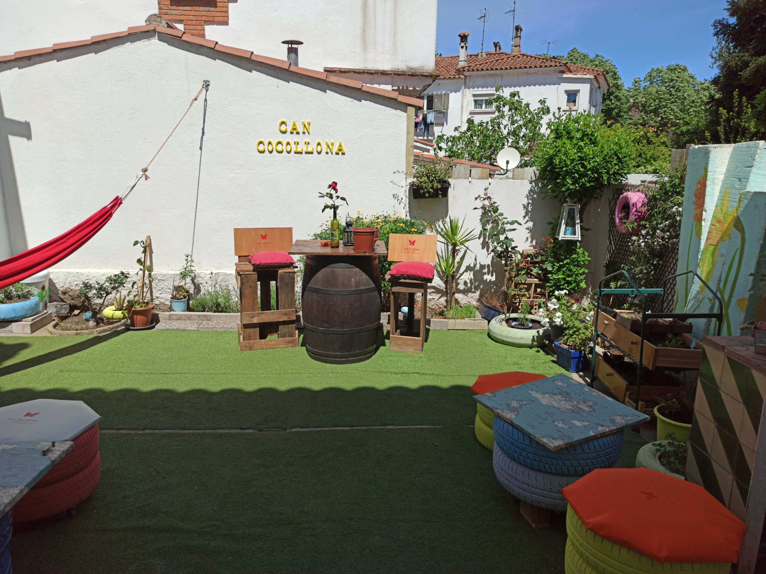 El pati de Can Cocollona és el punt més emblemàtic de trobada de la casa. Aquí és on ens reunim i ens expliquem com ha anat el dia, quins plans tenim, intercanviem experiències d’altres viatgers i organitzem activitats conjuntament: àpats, barbacoes, jocs de taula… Un també pot relaxar-se tranquil·lament, llegir o escoltar música mentre es balanceja sobre l’hamaca o assegut en un dels mobles reciclats, alguns fets amb portes d’armari de la mateixa casa o rodes de pneumàtic que ara són puffs.